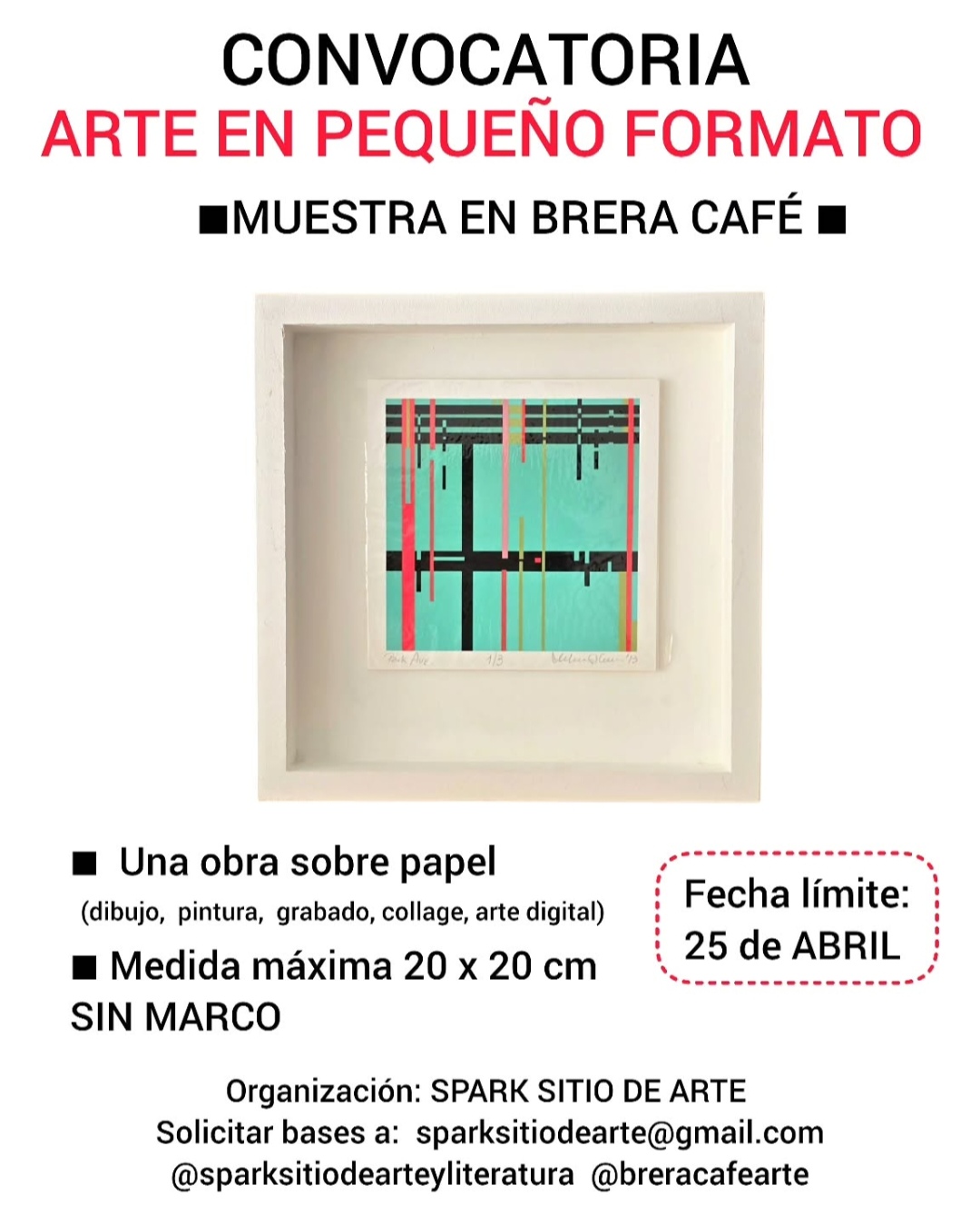 CONVOCATORIA ARTE EN PEQUEÑO FORMATO, muestra en Brera Café, convocatoria abierta a artistas argentinos y extranjeros, formato 20x20 centímetros, solicitar información a sparksitiodearte@gmail.com, fecha límite 25 de abril.