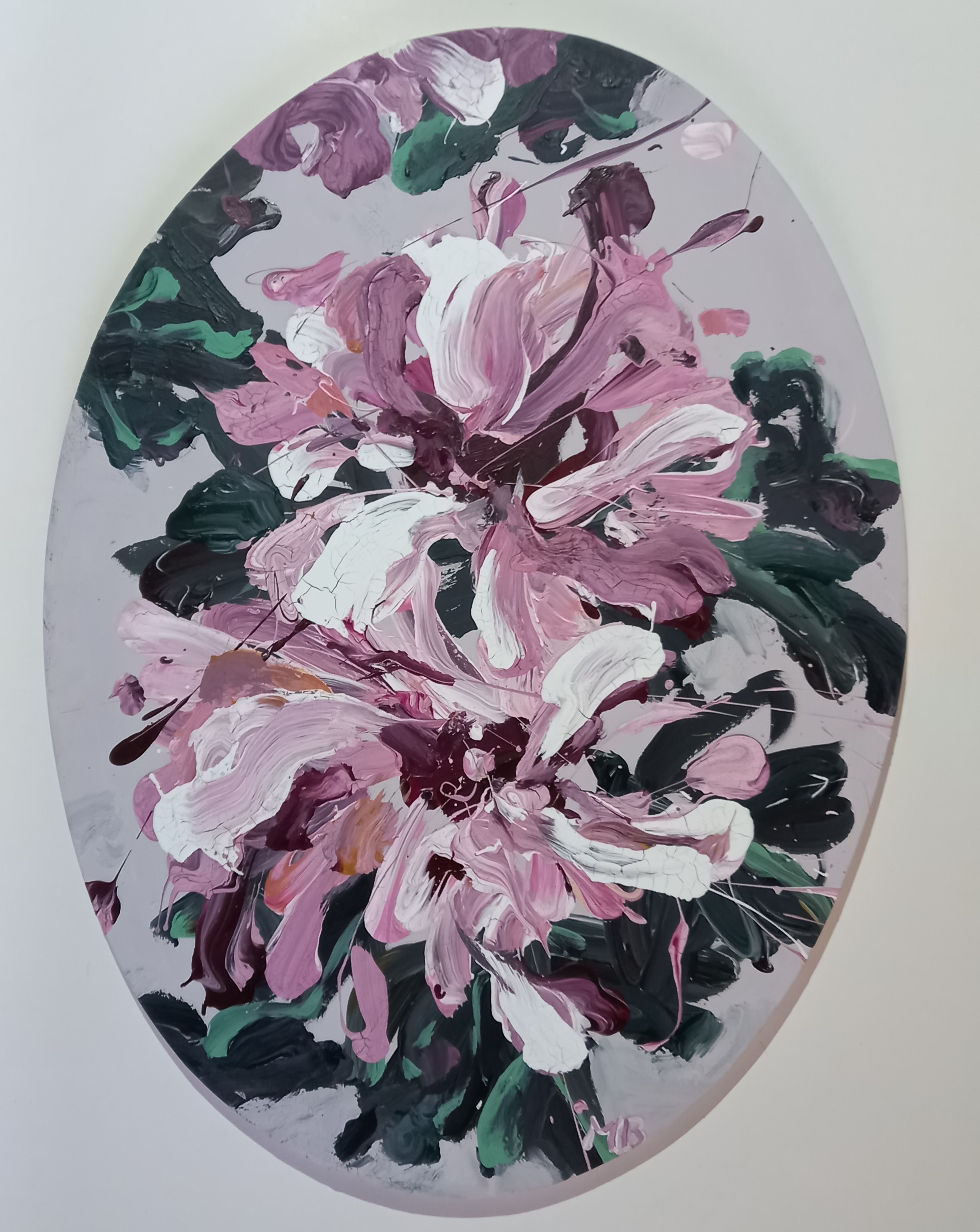 Es un cuadro de forma oval realizado sobre bastidor de madera con pinturas acrílicas.