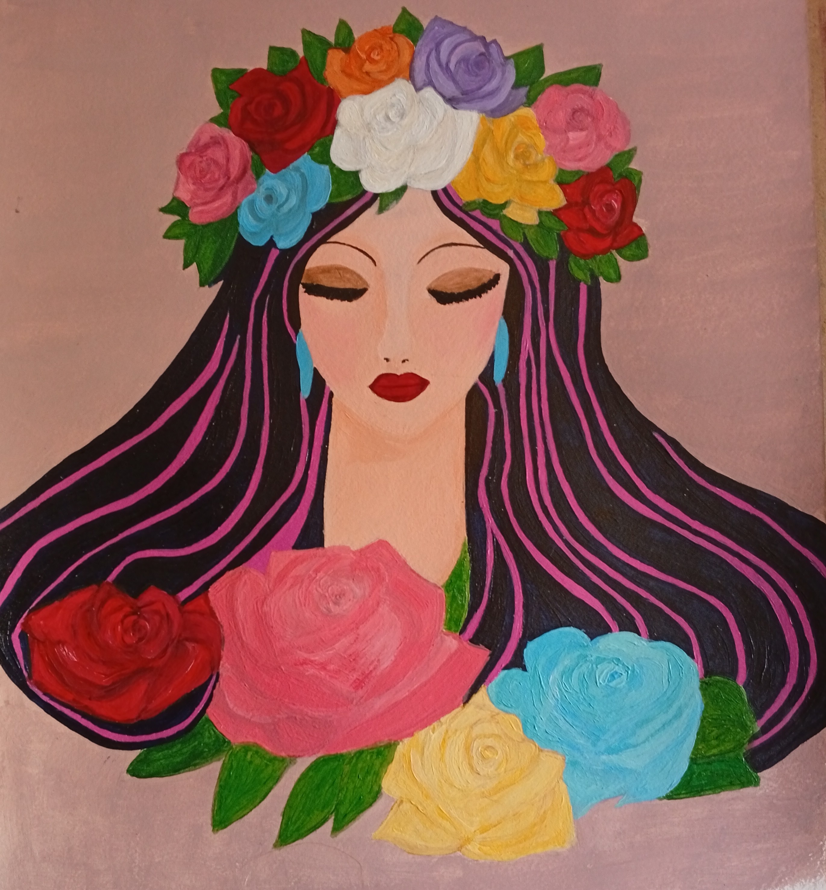Técnica: Destaca el tratamiento de las rosas con una pincelada matérica y volumétrica que contrasta con la suavidad etérea del rostro.