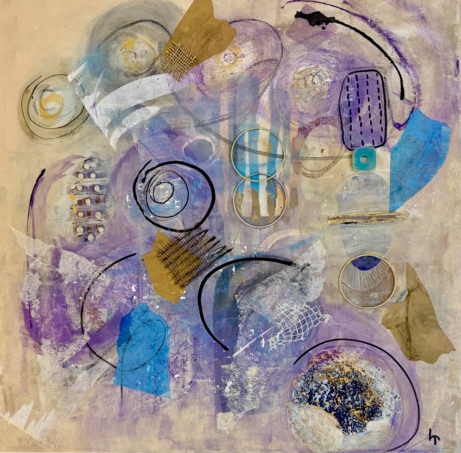 Composición creada a través de la técnica mixta, donde diferentes capas se combinan para representar movimiento en tonos de lavanda y celestes.