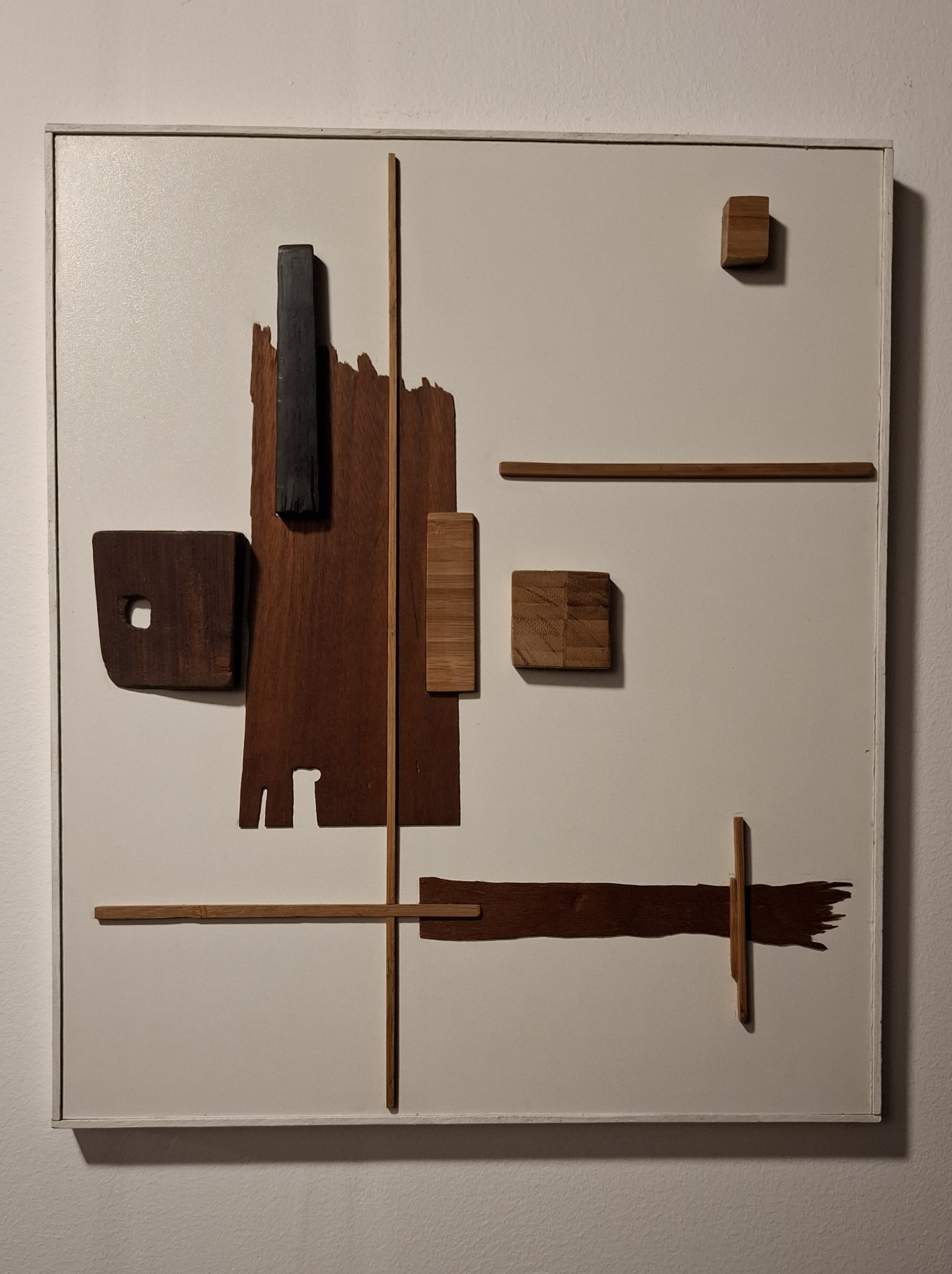 Montaje de maderas varias sobre soporte de mdf melaminico blanco.