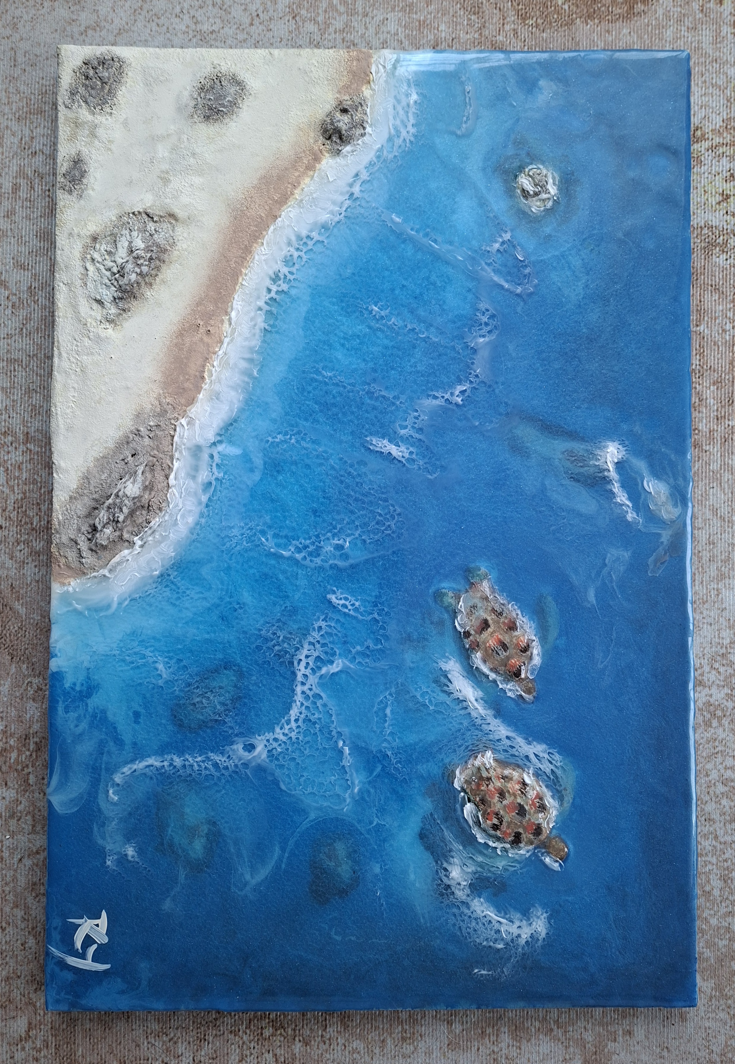 Obra realizada con acrílicos, resina y detalles en masa para modelar que le dan relieve y vida propia. Las tortugas emergen entre las olas creando una escena dinámica, con profundidad y movimiento real.