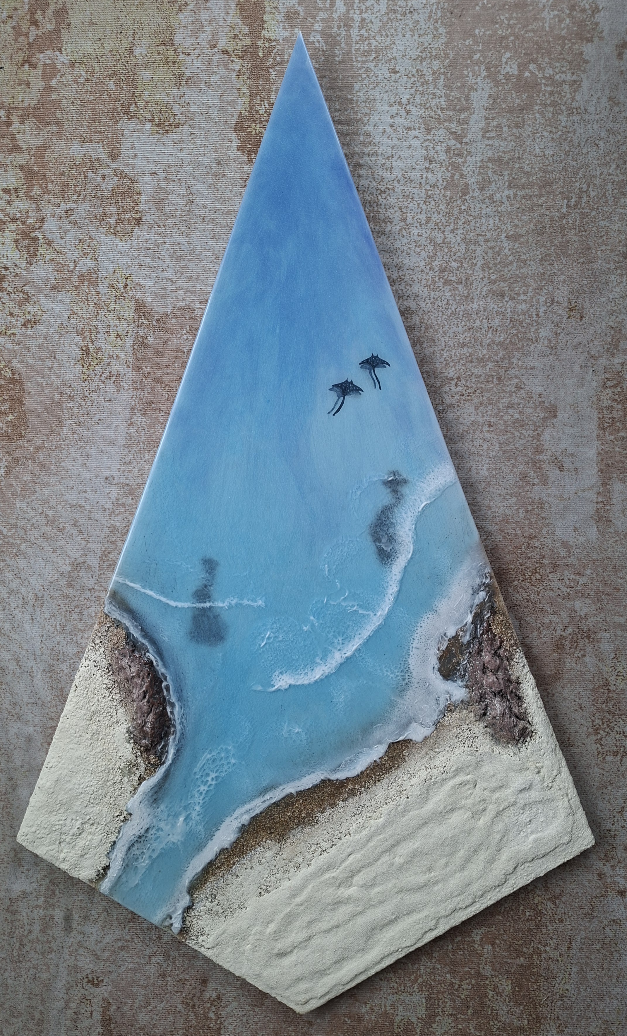 Obra realizada con acrílicos, resina y masa para modelar, donde el mar se despliega en un formato triangular único que guía la mirada hacia el horizonte.